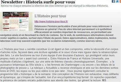 « L’Histoire pour tous » semble constituer à cet égard un bon compromis, entre la nécessité d’un corpus d’articles riche, façonné dans une écriture agréable et le souci d’une vraie rigueur dans la retranscription des faits. Le site fonctionne au tour d’une équipe d’une douzaine d’auteurs, qui privilégient selon leurs propres mots un ton « avant tout convivial ». Entre Histoire de France et Histoire Universelle, une multitude d’articles s’égrènent, sur une série de thèmes classés chronologiquement. Exemples : « la puissance britannique au XIXe siècle », « les femmes de Charlemagne » ou encore « les débuts de la photographie de presse ». La rubrique « Actualités » recense chroniques et avis sur les dernières sorties livres et DVD, les expos ou les jeux vidéos à ne pas rater...Vous pourrez également consulter le programme télé « historique » de la semaine. Une conception de l’Histoire non exhaustive, mais édifiante et dynamique, qui s’inspire de l’actualité, loin d’un encyclopédisme trop formel. Historia, mai 2011.